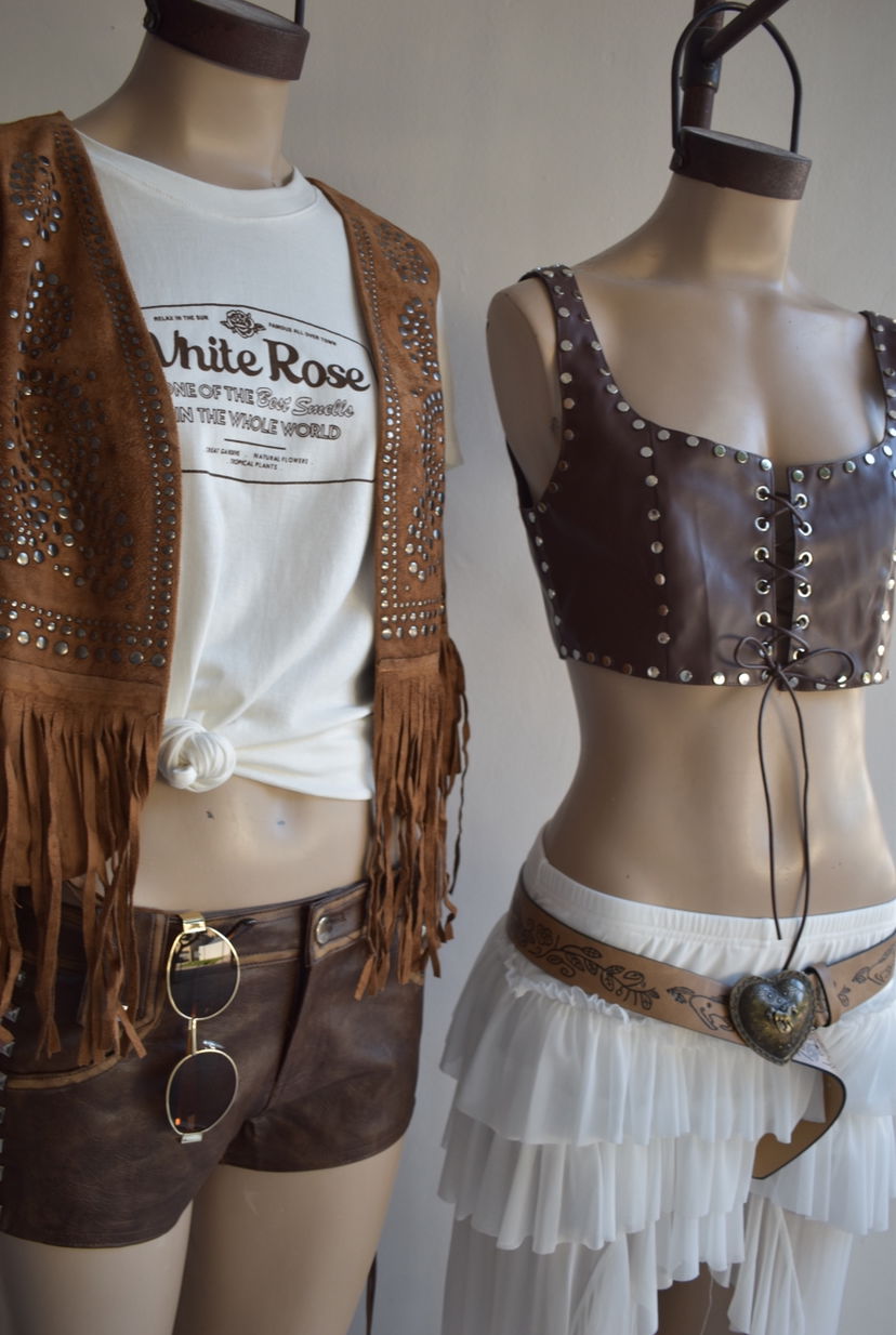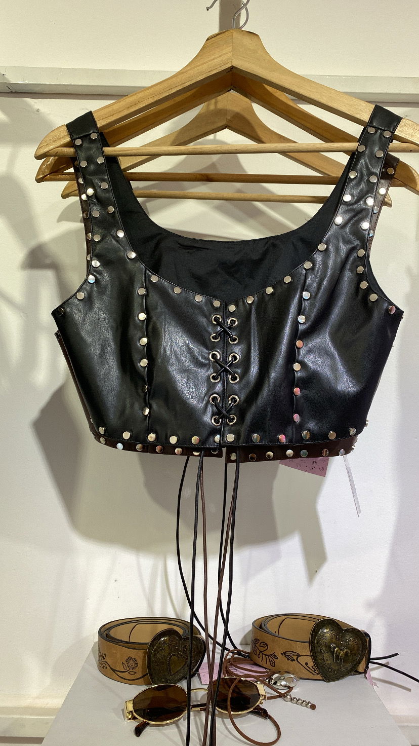 Disponible en negro y en marron. Con tachas. Frente con tiras para atar.