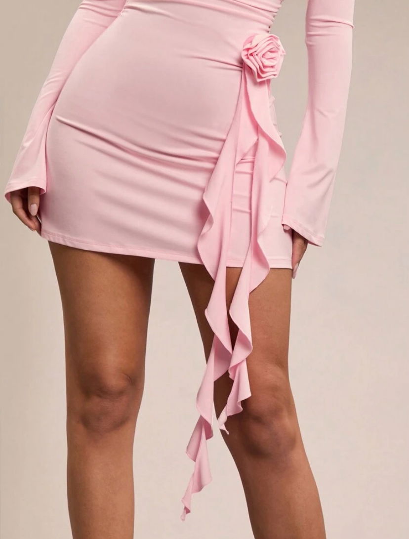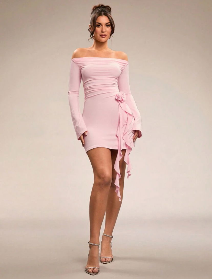 Vestido microfibra. Cuerpo elastizado, volados y detalle de flor. Escote francés