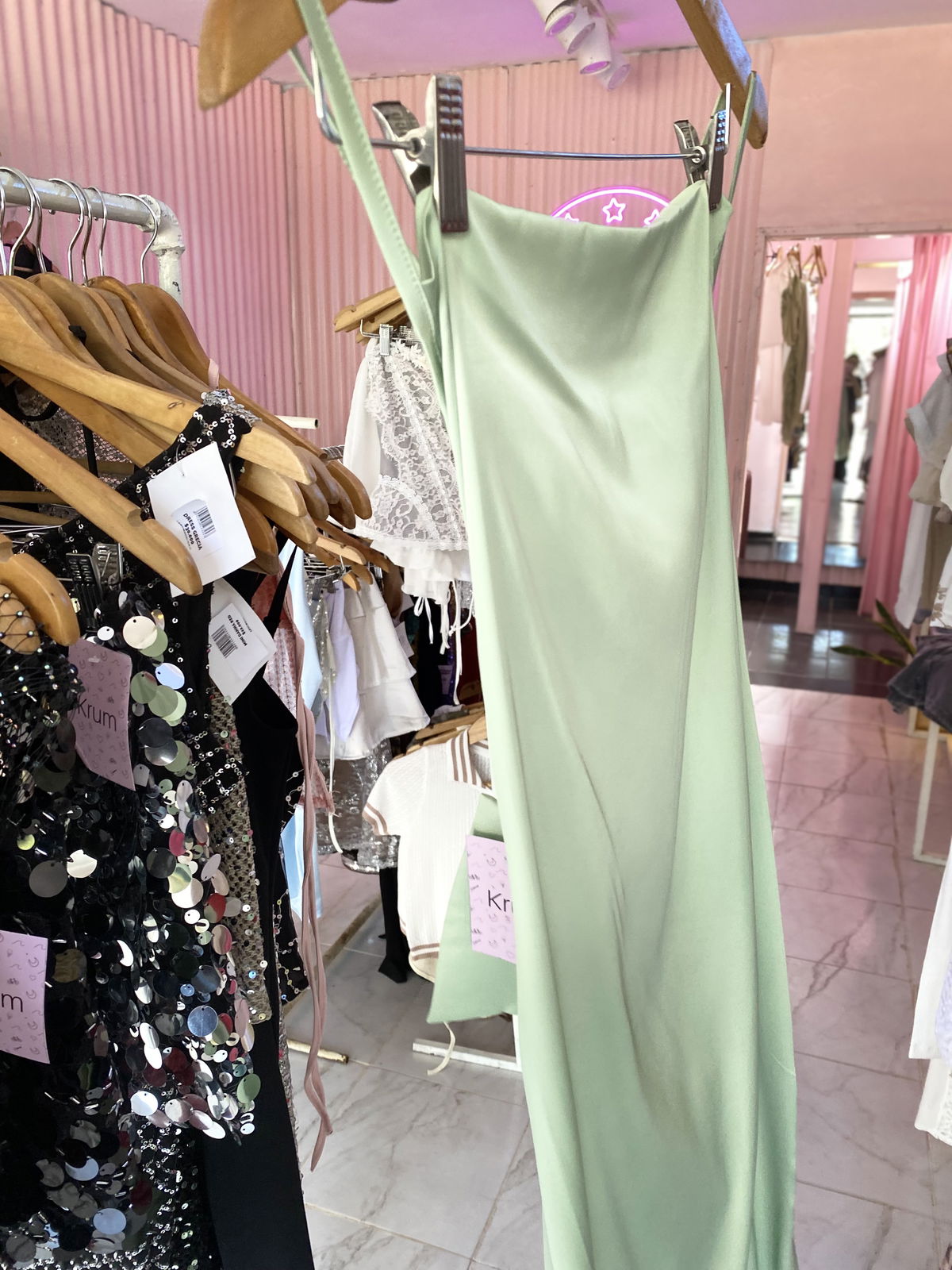 Vesrido satinado con volados en el final y moño en la espalda. Breteles regulables