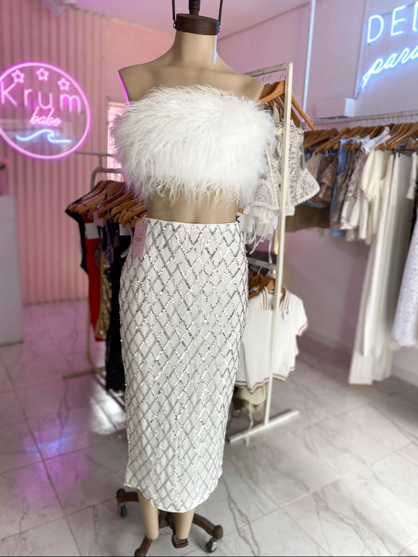 Conjunto de to peludo con cierre trasero. Falda con rombos de lentejuelas
