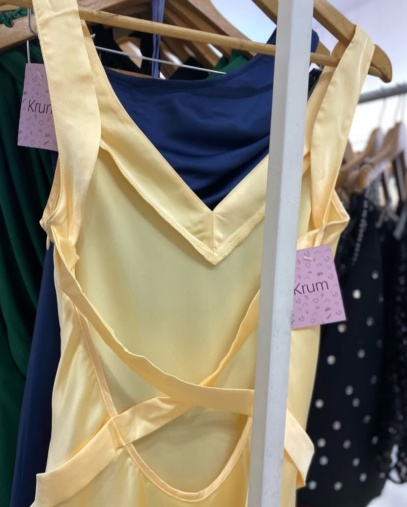 Vestido amarillo satinado. Cierre invisible. Tiras en la espalda.